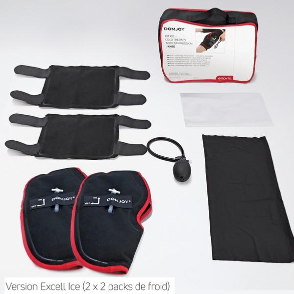 • - Cryothérapie & Compression : 2 packs de froid antérieurs + 2 packs de froid postérieurs pour une application localisée de cryothérapie compressive recouvrant toute la circonférence du genou.